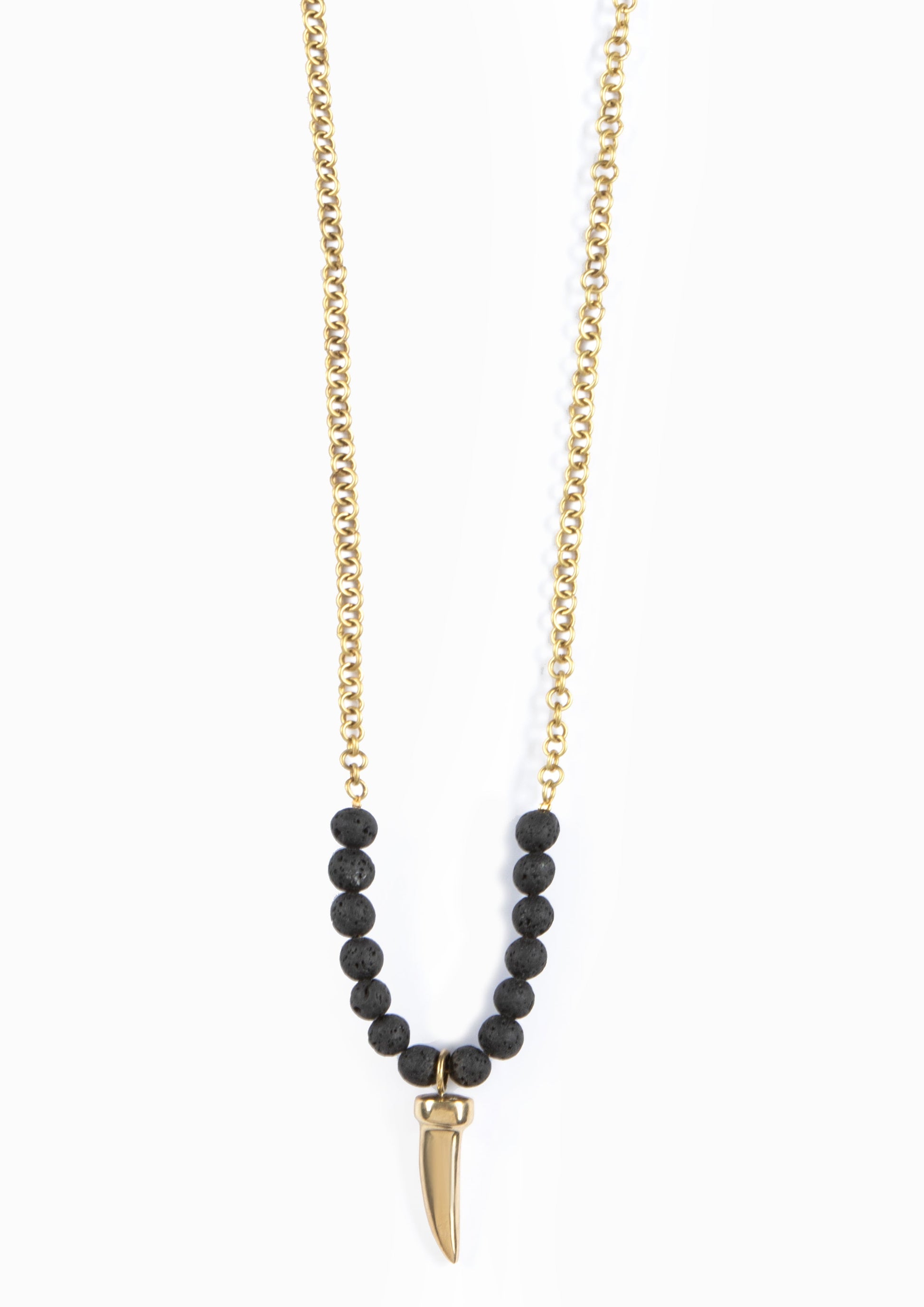 Handmade 100% recycled brass charm + necklace chain, beaded with lava beads.